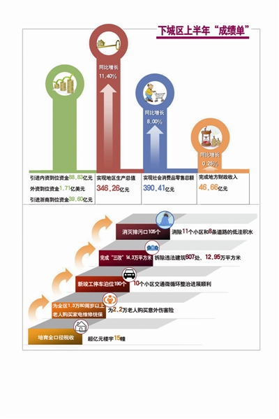 东南形胜,三吴都会,武林自古繁华。近日,下城区九届八次全体(扩大)会议召开,作为杭州市中央商务区的下城交出上半年“成绩单”——实现地区生产总值346.26亿元,同比增长11.40%;完成地方财政收入46.66亿元,同比增长0.25%;实现社会消费品零售总额390.41亿元,同比增长8.00%。