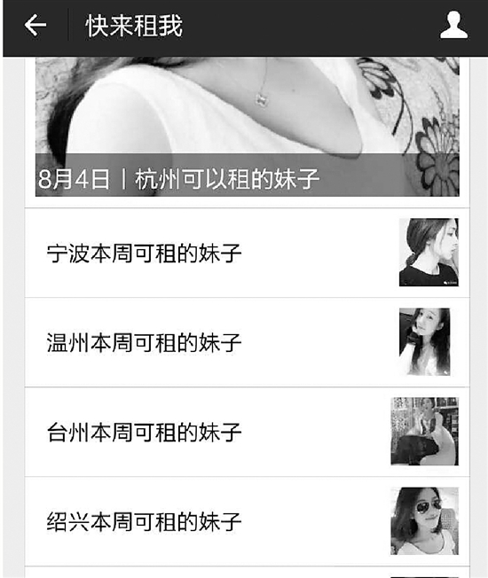 近日以来,某个微信公众号就打出了这个旗号,说是杭州乃至全国,都可以通过他们这个平台租到妹子和汉子。每个妹子和汉子,都配了照片,注明了他们的出租范围,大都是吃饭、逛街、压马路……但是,他们还有一句原话——就是那个啥不行(你懂的)。