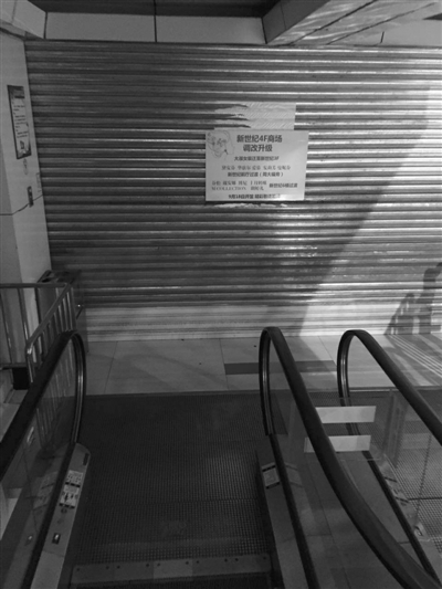 但到达四楼时,整个楼层正在进行大调整,专柜货品、货架几乎都已撤空,记者打算下楼,但发现下行的自动扶梯在中庭另一边,已经被挡板封起来,无法到达,欲寻找升降电梯,周围又一片昏暗。最后只能继续乘自动扶梯上行到五楼,在那里才找到下行的电梯,得以返回楼下。