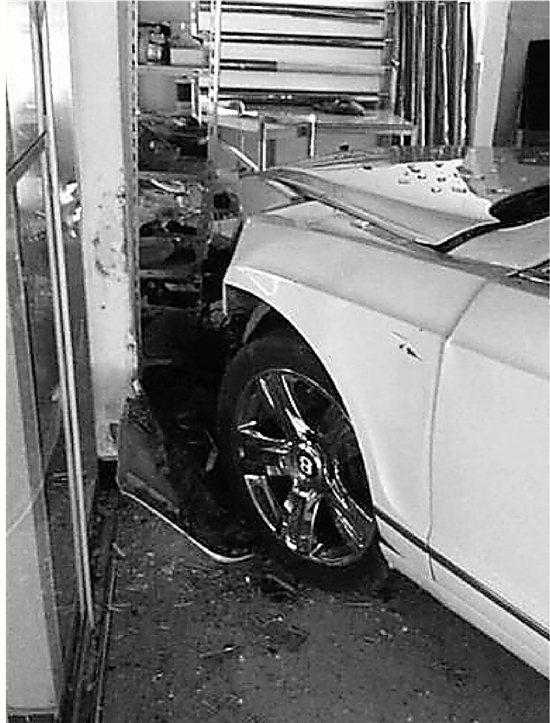 6月25日,一位不愿意透露姓名的市民说,当天上午一辆价值数百万元的宾利轿车,在富阳区西堤南路一家洗车行里撞了墙,撞得很厉害,估计维修费少说也得几十万元。他提供的几张照片也显示,白色宾利的前车盖拱起,半个车头损毁严重,右侧车尾受损不轻。