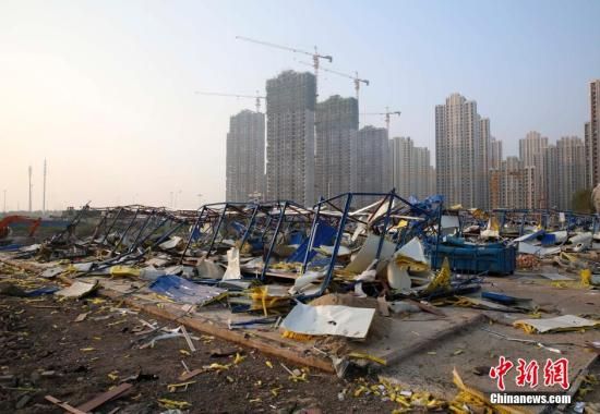 8月13日6时,爆炸事故现场旁被冲垮的简易房。8月13日6时,爆炸事故现场旁被冲垮的简易房。