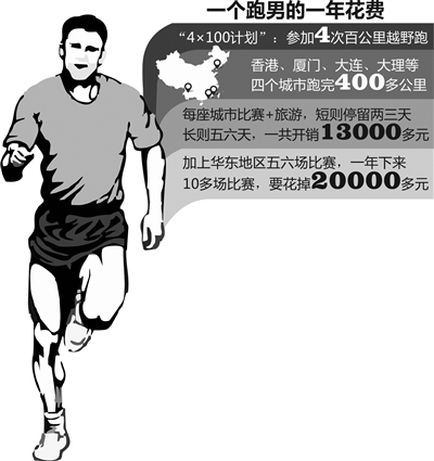 去年,徐锦祥到香港、厦门、大连、大理等四个城市跑完400多公里,每座城市短则停留两三天,长则五六天,一共开销13000多元。“加上华东地区五六场比赛,一年下来10多场比赛,要花掉20000多元。”徐锦祥说,这还不包括杭州本地的比赛。