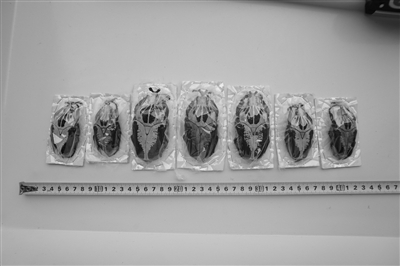 日前,浙江检验检疫局邮检办工作人员在从波兰邮寄进境的包裹中截获7只白纹大角金龟甲虫标本。这是继2014年3月全国首次截获之后,再次在杭州进境邮包中截获白纹大角金龟甲虫标本。