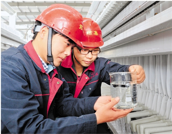 嵊新污水处理厂内,技术人员正在查看处污后的水质。