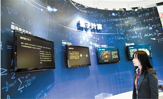 多款量子通信产品亮相云栖大会。图为参观者在观看中国科技大学的量子计算系统介绍。龙巍摄