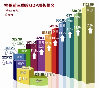 在此份榜单中,滨江、西湖、下城、江干、余杭继续保持经济两位数增长态势,分别以13.2%、11.7%、 11.3%、11.2%和11%的增长速度,继续助力杭州留在两位数增长区间,五地GDP相加之后,经济总量达到2832.64亿元。