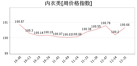 内衣类本周价格指数为100.66点,小幅反弹。内衣行业近期保暖类产品持续畅销。恒温超薄款莫代尔内衣较受年轻女性喜爱,销势稳健;毛、绒等材质的保暖内衣销量稳定,后市看好;塑身丰胸保健文胸成为今冬消费热点,莫代尔、珍珠棉等材质的文胸最受女性消费者喜爱,销量稳步上升。