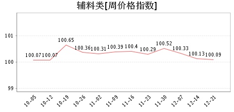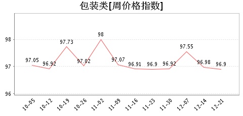 包装类本周价格指数为96.9点,微幅下调。包装行业近期需求攀高,行情正旺。销售包装类产品以纸质、PP材质的礼品袋最为热销,目前以国内订单为主,PP小礼品包装盒、赠品、试用装包装盒、中高档纸质礼品袋等产品销势稳步上扬;红色、金色纱质喜字烫金袋、PVC普通型喜糖袋等产品销势强劲;年末商战带动铜版纸酒袋、LOGO广告袋热销;麻袋、编织袋、大型塑料袋等运输包装类产品销量平稳。
