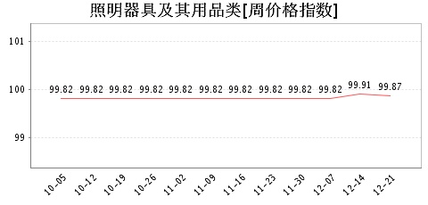 照明器具及其用品类本周价格指数为99.87点,小幅下行。照明器具及其用品行业近期整体销势保持平稳。电光源材料、射灯、电筒年末外贸备货接近尾声,东欧、东南亚、中东、俄罗斯等地有少量补货;电池类产品主销江苏、福建、安徽及省内各县市,销量稳定;LED灯类产品不断优化出新,可以遥控全屋照明的智能照明系统颇受国内采购商青睐,后市可期。