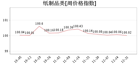 纸制品类本周价格指数为100.02点,微幅下调。近期纸制品行业整体行情较好。圣诞、元旦来临,圣诞贺卡、喜庆请柬销售火热,各种卡通图案、圣诞图案和立体贺卡销势突出;信纸、彩纸、活页本和装线本行情同步升温;不干胶纸产品随着外贸行情走旺销量上扬;复印纸、打印纸、传真纸、铜版纸等日常办公用纸国内外行情稳步升温;素描纸、宣纸近期以内销为主,销势稳定。