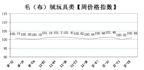 毛(布)绒玩具类本周价格指数为100.99点,小幅反弹。毛(布)绒玩具行业近期场内人气小幅升温,成交向好。内销方面,圣诞来临,各种圣诞毛绒玩具周边县市客商补货积极;受年底婚庆活动增多影响,卡通布偶、大件熊玩具销势趋旺。外销方面,毛绒材质的抱心熊、芭比娃娃及各类动物造型玩具深受欧美客商青睐;一些具有中国传统特色的毛(布)绒玩偶销量增加。