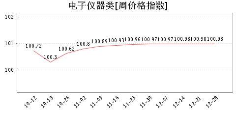 电子仪器类本周价格指数为100.98点,走势平稳。临近年底,电子仪器行业整体行情保持稳健。电子秤、钢化玻璃人体秤、普通放大镜、中低档观景镜等产品销势良好;用于玩具配件的二、三极管和内置扬声器、传感器等产品销势有所回升;受冬季火灾多发期到来影响,烟雾报警器、火灾报警器、室外监控器等安防器材订单增多。