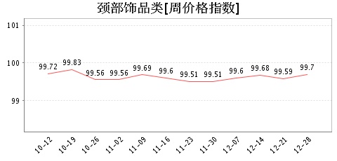 颈部饰品类本周价格指数为99.7点,微幅上涨。颈部饰品行业近期整体销售小幅走俏。内销方面:翡翠吊坠、天然水晶吊坠成为场内销售亮点,批零两旺;西瓜碧玺、绿红天然发晶、玉石挂件等中高档产品深受游客喜爱;树脂亚克力项链、桃心带钻吊坠等新品销量喜人。外销方面:吊坠类、非串制类、合金类、亚克力串制类等中低档产品主销中东、东南亚、非洲等地,行情回暖。