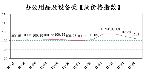 办公用品及设备类本周价格指数为101点,持续下行。近期办公用品行业销势稳中有升。大头针、回形针、图书钉等钉类、针类案头用品各地客商备货积极;长尾夹、双面胶、固体胶等胶水(带)类产品以周边县市客商采购为主;印章、印油、复写纸、海绵缸等财会用品近期以场内现货成交居多;墨盒、墨粉、油墨等办公耗材销量持稳;文件夹、档案袋、奖励用品老客补单较多,销势稳定。