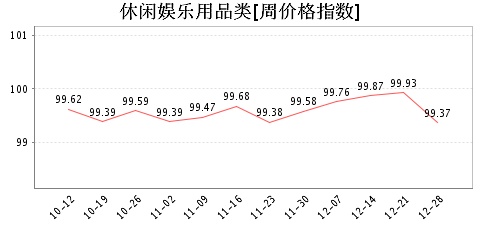 休闲娱乐用品类本周价格指数为99.37点,微幅下调。休闲娱乐用品行业近期总体销势表现良好。海钩、抛竿等海钓用品销势突出,渔钩、浮漂、渔网等配套产品销势稳定,澳大利亚等南半球及热带国家需求看好;扑克、纸牌、麻将等棋牌类产品备货启动,中国象棋、围棋畅销国内各地,骰子、骨牌则主销俄罗斯等地;帐篷、睡袋、吊床及登山装备主销中东等地,销势平平。