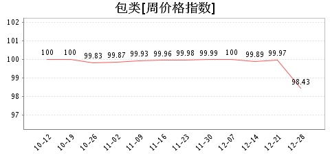 包类本周价格指数为98.43点,小幅下调。包类行业近期春季新品基本上架完毕,挎包、拎包、背包多加入流苏、绒面、金属链条、粘花等装饰,褶皱、编织在皮制类挎包上也有大量使用,客户反应良好,补货较多;随着春节临近,节庆因素利好旅游包、大挎包的销势,红色系为主的款式销售较好;手提包、拉杆包等帆布材质的两用包销售走俏;书包类产品销势平稳,等待年后开学季旺销行情。