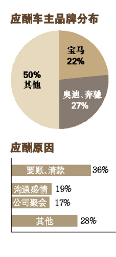 报告数据显示,在所有应酬人群中,宝马车用户占比22%位居第一,取代了奥迪车。从整体数据看,宝马、奥迪、奔驰用户整体占应酬人群的50%以上。据介绍,从使用e代驾的客户用车来看,以前奥迪、大众的中级以上轿车占比要高于宝马等品牌,今年被宝马取代了。