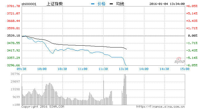 今日13点40分许,上海证券交易所发布公告称:沪深300指数今日13时33分较前一交易日收盘首次下跌达到或超过7%。根据《上海证券交易所交易规则》的有关规定,本所决定,自2016年01月04日13时33分开始实施指数熔断,当日不再恢复交易。