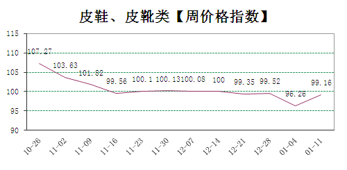 皮鞋、皮靴类本周价格指数为99.16点,小幅回升。皮鞋、皮靴行业近期整体行情小幅趋旺。内销方面:韩版女式皮棉鞋、皮棉靴等产品受到各地消费者青睐,需求走俏;高跟长筒女式皮靴、皮毛一体雪地靴等产品销售火热。外销方面:新上市的多款儿童卡通皮鞋主销韩国、日本、中东等地,成交放量。