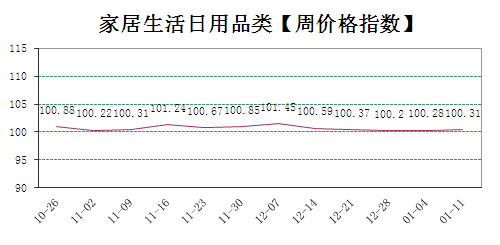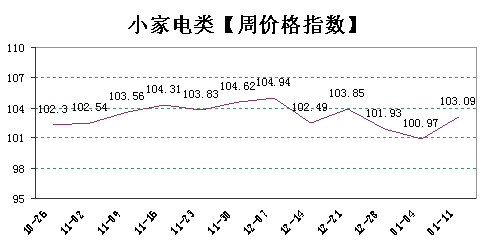 小家电类本周价格指数为103.09点,小幅反弹。近期小家电行业整体销势保持良好。内销方面,紫砂煲、加湿器、足浴盆等“养生保健小家电”销售走俏;皮汁分离式榨汁机、豆浆机、电炖锅等厨用小家电销量稳中有升;电动剃须刀、卷发器、电吹风等美容美发小家电年底需求增势明显。外销方面,一次性剃须刀、刀架、刀片畅销中东等地,其中优惠型组合套装深受各地外商青睐,销量可观。