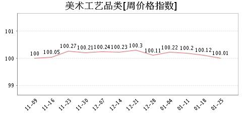 美术工艺品类本周价格指数为100.01点,微幅下滑。美术工艺品行业近期整体销势保持良好。内销方面:年关将近,美术工艺品内销行情喜人,手工艺品和地方特色产品较受消费者青睐;各类仿真花、干花、花瓶、花篮等装饰性产品批零成交表现不俗。外销方面:创意雕塑类工艺品受到外商关注,订单增多;欧式风格相框、油画、抽象艺术摆件等产品销量趋于平稳。