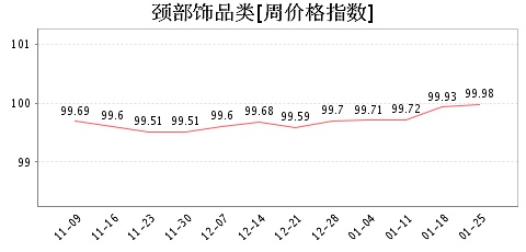 颈部饰品类本周价格指数为99.98点,持续小幅上行。颈部饰品行业近期场内成交气氛表现活跃。内销方面:临近春节,老客补货、备货行为频繁,其中经典深海蓝奥地利水晶项链销量可观;新款合金小猴项链深受消费者青睐,采购火热。外销方面:中低档合金类、亚克力类颈部饰品深受中东、南美、非洲等地客商喜爱,下单频繁。