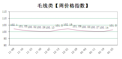 毛线类本周价格指数为101.5点,止跌回升。毛线行业近期内贸行情小幅升温。内销方面:手工山羊绒、全羊毛毛线等产品销售走俏;貂绒纱线、兔毛纱线等产品销量稳定;普通纱线、花式纱线、丝光线等产品主销各围巾厂家,成交放量。外销方面:价格较低的腈纶、丙纶、涤纶纱线等产品销售有所放缓。