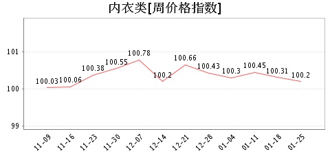 内衣类本周价格指数为100.2点,持续下跌。内衣行业近期内销行情趋于火热。气温走低,毛、绒等保暖性能较好的内衣销售走俏;保健功能型内衣、加厚黄金甲保暖内衣等产品销势看好;透气性好的竹炭纤维、弹性好的莫代尔、有护肤功能的珍珠棉等材质的内衣销量上升;新年来临,红色内衣裤需求趋旺。