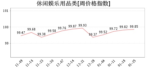 休闲娱乐用品类本周价格指数为99.85点,微幅上涨。春节将至,休闲娱乐用品行业总体行情保持良好。三国杀、方格斗士、五子棋、飞行棋、斗兽棋等儿童类棋具用品各地客商补货积极;钓竿、鱼钩、浮漂等钓具受近期南方雨雪天气影响,销势减弱;扑克、麻将、象棋、围棋等产品迎来一波老客补货高峰。