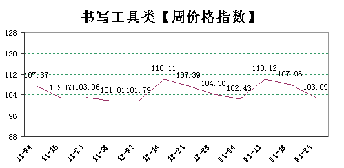 书写工具类本周价格指数为103.09点,小幅下行。书写工具行业近期整体销势以稳为主。随着年末学校各类考试增多,铅笔、圆珠笔、中性笔、笔芯等产品以学生用品店及学校采购为主,需求增长明显;毛笔、画笔、水彩蜡笔等美工用笔销售保持稳定;笔筒、削笔器、墨水、橡皮、修正液等产品销势平平。