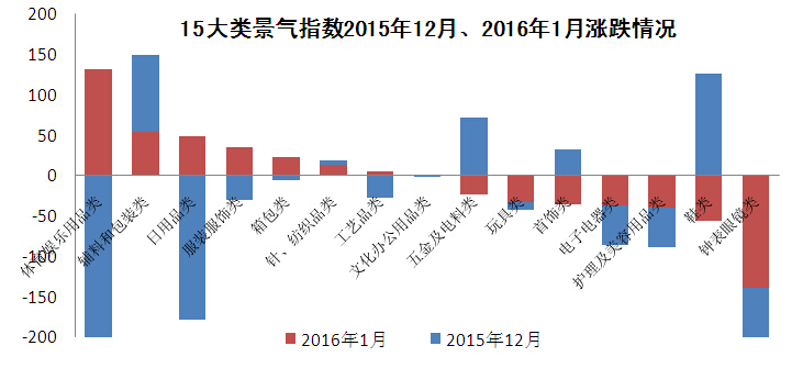 本月15个行业中有8大类景气指数环比上涨,体育娱乐用品类、辅料和包装类、日用品类处于涨幅榜前列,环比分别上涨131.15点、54.91点、48.96点。其中,辅料和包装类、针·纺织品类2大类景气指数2015年12月、2016年1月持续上涨,体育娱乐用品类、日用品类、服装服饰类、箱包类、工艺品类、文化办公用品类6大类景气指数1月份止跌反弹。