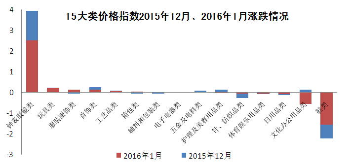 15个行业中有8个大类月价格指数环比上涨,钟表眼镜类、玩具类、服装服饰类处于涨幅榜前列,环比分别上涨2.51点、0.22点、0.15点。其中,钟表眼镜类、玩具类、首饰类、工艺品类4大类月价格指数持续两月上涨;服装服饰类、箱包类、辅料和包装类3大类月价格指数止跌反弹,电子电器类上月持平后上涨。
