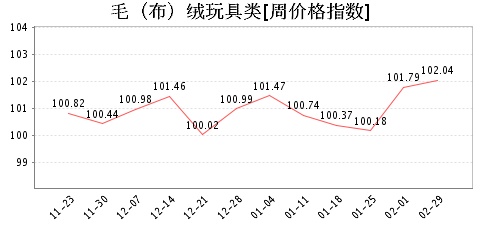 毛(布)绒玩具类本周价格指数为102.04点,小幅上涨。毛(布)绒玩具行业近期场内人气小幅回升,产品价格保持平稳。内销方面,随着年后各地幼儿园陆续开学,各种普通毛(布)绒玩具需求上升;形态各异的新款猴类毛绒玩具受到采购商欢迎,销势突出。外销方面,毛绒熊、芭比娃娃等传统毛(布)绒玩具受到中东、欧美、东南亚等地客商喜爱,询价看样有所增多。