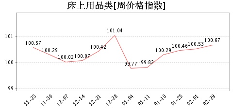 床上用品类本周价格指数为100.67点,持续上涨。床上用品行业节后行情启动,内外贸客商回流明显。内销方面,澳绒、天丝磨毛、纯棉四件套和法莱绒、拉舍尔、珊瑚绒毛毯等传统产品以老客补货居多;抱枕、记忆枕、绗缝被等产品销势突出。外销方面,棉线毯、朝拜毯、涤棉套件、沙发桌椅套件、靠枕等产品以中东、东南亚等地客商补货为主,销量稳定。