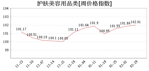 护肤美容用品类本周价格指数为102.01点,持续上涨。护肤美容用品行业春令新品上市频繁,老客返单补货较多。时值换季,面部护理需求侧重防晒、隔离、美白等,洁面乳、面膜、隔离霜等颇受消费者青睐,销量突出;洗手液、沐浴乳、防晒霜等身体护理品走量喜人;彩妆用品无明显季节性特征,近期以隔离粉底类产品销售为主,整体销量稳定。