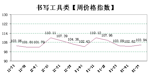 书写工具类本周价格指数为103.94点,波动上行。近期书写工具行业整体行情走好。随着年后学校开学和企事业单位开工,国内老客返单积极,新品需求旺盛,各类品牌铅笔、圆珠笔、中性笔、笔芯等产品走量可观;随着各类兴趣班开班,毛笔、画笔、水彩蜡笔等美工用笔销量上涨;笔筒、削笔器、砚台、墨汁、橡皮、修正液等配套用品销量稳中有升。