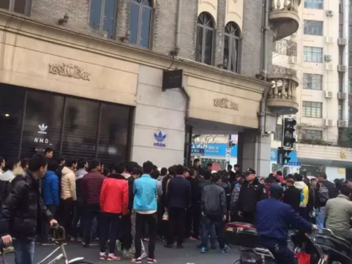15日晚上阿迪达斯发布了NMD在中国区的销售策略,在部分门店以“先到先得”的方式限量发售。16日中午,上海南京西路便已经开始有人排队,到了傍晚由于人数过多,阿迪达斯取消了南京西路店的发售。随后北京三里屯店也取消了销售计划。