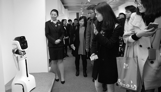 在近日的“十二五”时期上海国际金融中心建设回顾展上,观众与交通银行的机器人“大堂经理”互动。新华社发