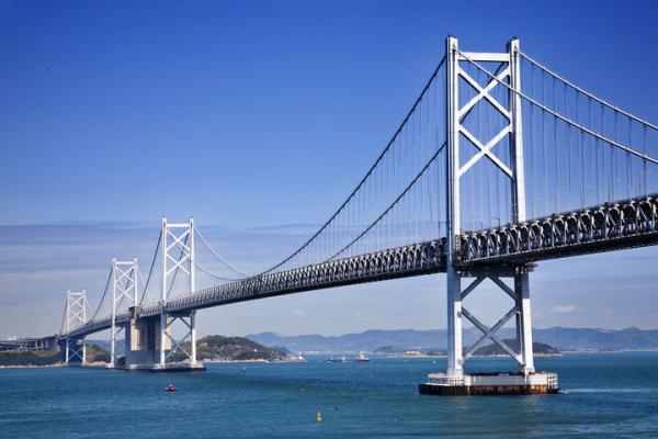 濑户大桥是日本一座位于本州(冈山县仓敷市)到四国(香川县坂出市)之间,跨越濑户内海的桥梁,属于本州四国连络桥路网的三条路线之一。全桥由多座吊桥、斜张桥与梁桥连结,构成壮观的桥梁群,总长度达37公里,跨海长度为9.4公里。该桥在1978年10月10日开工,施工耗时近10年,到1988年4月10日始全面通车。