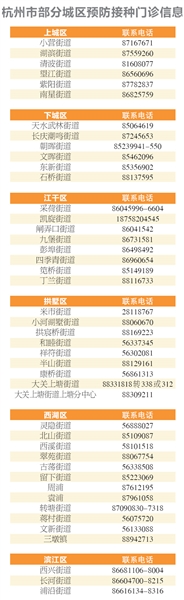 杭城哪里还有流感疫苗可以打?我们特地整理了一份预防接种门诊信息,部分城区街道社区卫生服务中心联系方式详见右表,有需要的市民前往接种前,最好先打电话咨询一下。