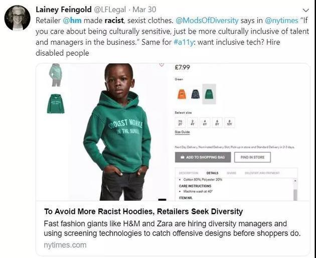 今年1月,来自瑞典的快时尚巨头H&M陷入种族歧视丑闻。起因是该品牌找来一位黑人小男孩当童装模特,但其身着的卫衣上面写着“COOLEST MONKEY IN THE JUNGLE(丛林里最酷的猴子)”,而另一位白人小男孩身上写着的文字则有“SURVIVAL EXPERT(生存专家)”。