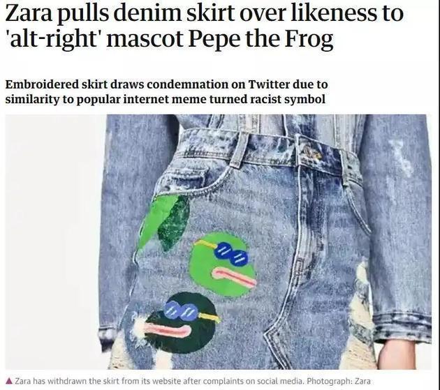 2017年,据英国《卫报》报道,Zara因为上架了一条绣着疑似青蛙Pepe头像的牛仔裙,而被指歧视犹太人。