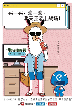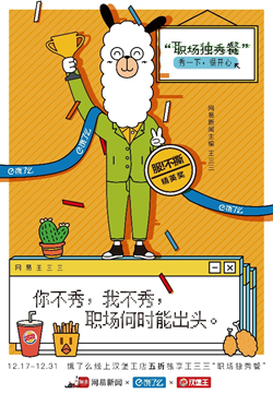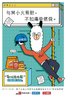 岁末,网易新闻联合饿了么与汉堡王,聚焦年轻人的职场现状,并以网易新闻主编王三三作为代言人,推出“职场独秀餐”,尝试用诙谐幽默的表达方式鼓励年轻人2019年在职场中勇于展示真我,保持自己的态度。这里的“独秀”,既不是通常意义的优秀标准,更不是充当职场“戏精”,而是一种适时表达自我,勇敢迈出步伐的职场态度。