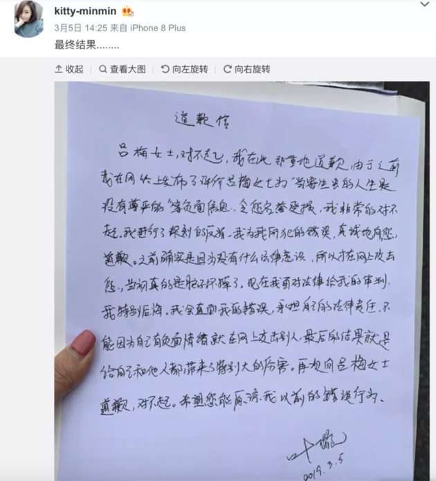 3月5号下午,微博网友@kitty-minmi(吕某)晒出一张演员叶璇手写道歉信的照片,写道:“最终结果!”此前,叶璇在网上辱骂她,并引发热议。