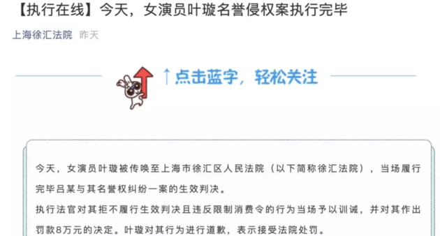 另据上海徐汇法院(以下简称徐汇法院)官方微信消息,3月5日,叶璇被传唤至徐汇法院,当场履行完毕吕某与其名誉权纠纷一案的生效判决。