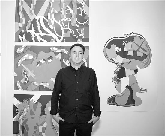 今年4月,KAWS在纽约参加活动时,与作品合影。视觉中国供图
