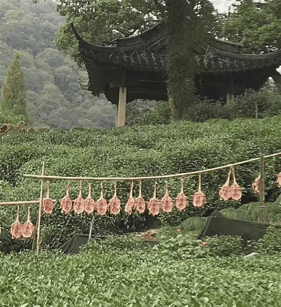 守月茶楼的梅先生这次做了100多只酱鸭,挂在高高的龙井山上,“茶山高,太阳足,酱鸭晒得好一点。”