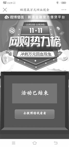 11月13日,微博借钱推出了一项“11·11网购势力榜”活动,只要用户在微博中晒出自己买的商品——红榜好物(即满意的商品)或者吐槽单品参与话题,依据点赞数的高低奖励相应的现金。那么如何提高榜单排名呢?除了邀请好友点赞助力,还可以通过在微博借钱金额大小将点赞数翻倍。不少追星粉们为了让明星爱豆代言的商品进入榜单,选择在微博进行借贷现金操作为自己喜欢的明星点赞打榜。然而,微博借钱所谓“最高不超36%年化利息”,而实际有的高达54%的年化率,遭到了不少网友的吐槽。为此,微博借钱官方却表示“均在国家法律要求的范围内”,高出法律规定利率的部分,平台解释为“手续费”。
