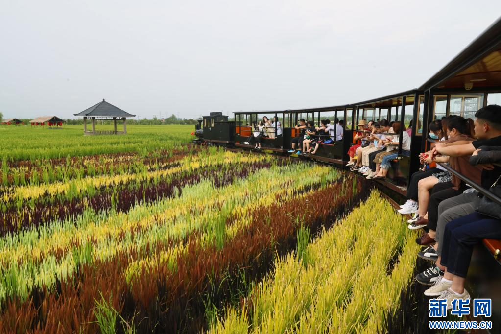 8月16日,游客乘坐小火车在稻田中观光游览。 近日,辽宁省沈阳市沈北新区锡伯龙地创意农业产业园的稻田画进入观赏期,多种色彩的水稻组成稻田画,吸引众多游人前来观光体验。 新华社记者 杨青 摄