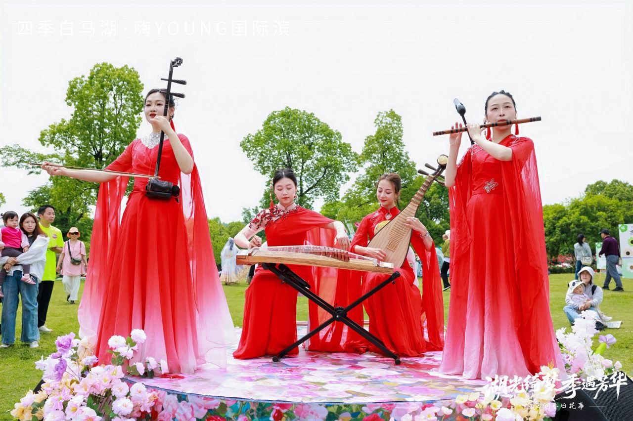 古典乐队以笛、筝、琵琶、二胡奏响春日最美乐章,游客或驻足细品,或闭目沉醉,纷纷举起镜头,在光影里定格这一刻的鲜活。